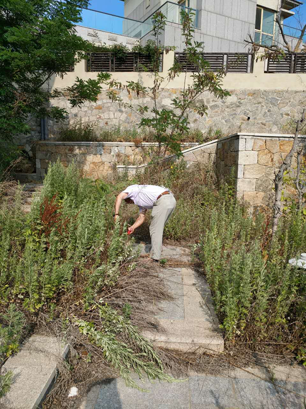 前幾天,物管中心去查看一處轉(zhuǎn)交過來的資產(chǎn),一進(jìn)院子,雜草叢生。唐建民一邊說著:“這哪像一戶人家。”一邊從車上拿出一只剪冬青的剪刀,就冒著烈日收拾起雜草來。