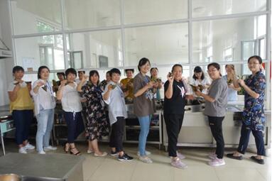 活動(dòng)原定下午1點(diǎn)開始,很多女職工都選擇了提前到達(dá),大家摩拳擦掌、躍躍欲試,都想一展身手。為充分弘揚(yáng)公司尊老、敬老的光榮傳統(tǒng),集團(tuán)女工委特意邀請退休職工張大姐進(jìn)行現(xiàn)場指導(dǎo)。配料、折葉、扎繩、蒸煮,大家分工明確、各顯其能,整個(gè)過程充滿了歡聲笑語。經(jīng)過辛勤勞作,幾百個(gè)形態(tài)各異的粽子新鮮出爐,清爽甘醇的味道飄滿了整個(gè)食堂,看著大家熱火朝天的勁頭,張大姐不時(shí)給予了贊許的目光。