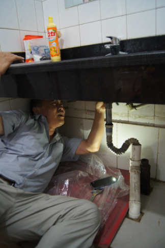 7月6日下午2時(shí),在順河街一處網(wǎng)點(diǎn)房的洗手間里,54歲的唐建民斜倚在地上,費(fèi)力地將頭伸入洗手盆的下面,維修壞掉的下水管道。當(dāng)天,室內(nèi)溫度大約在35攝氏度左右,狹小無窗的洗手間溫度更高。在手機(jī)手電筒微弱的光線下,唐建民認(rèn)真地工作著,難聞的味道與難耐的高溫仿佛對(duì)他沒有影響——如果忽略不停滴落的汗水的話。